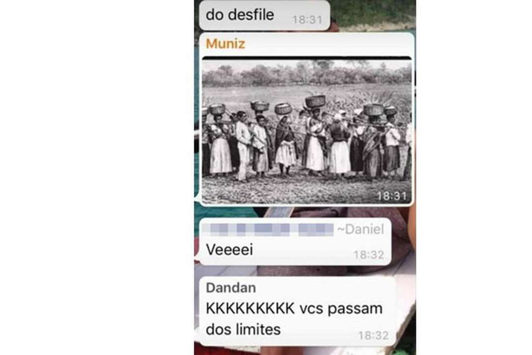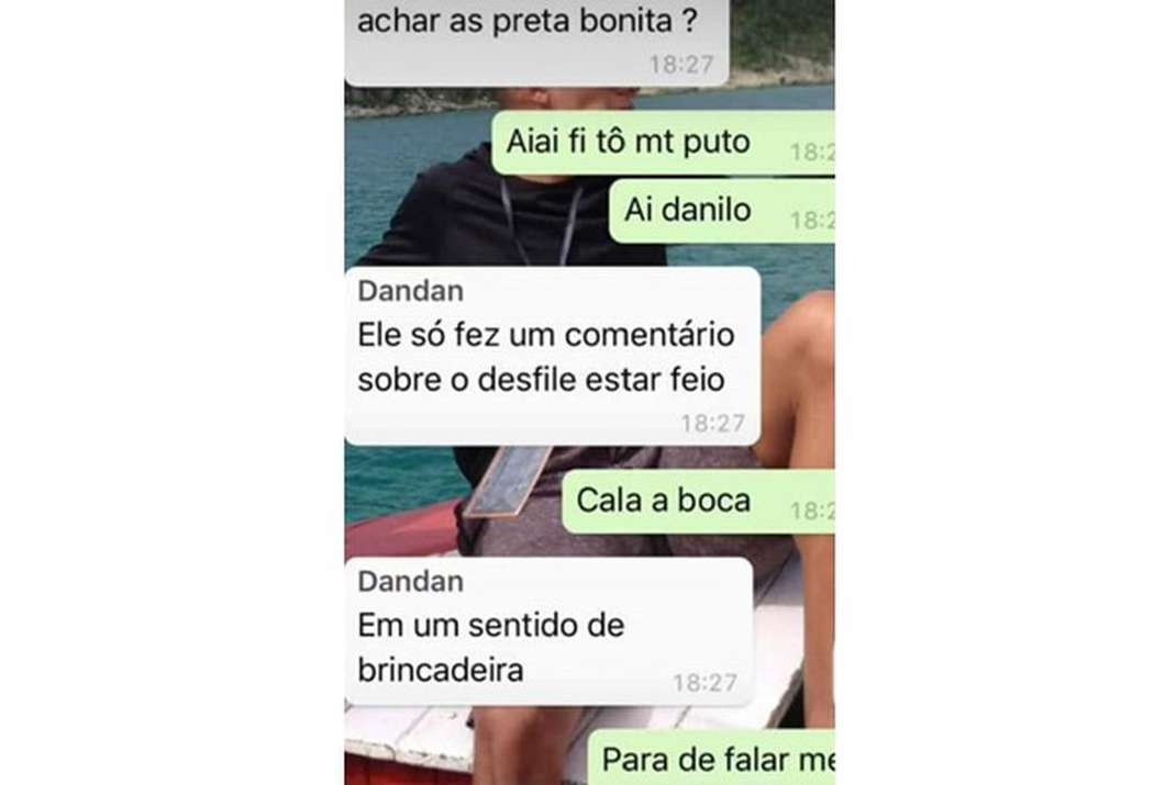 Uma outra pessoa identificada como Muniz dá apoio as mensagens racistas e solta gargalhadas, além de dar continuidade: “Mas é horroroso mesmo. Black moda week”, escreve. Muniz posta ainda uma foto ilustrativa de escravas enfileiradas as comparando com as modelos. Outras pessoas reagem às imagens e uma comenta: “achar preta bonita?”.