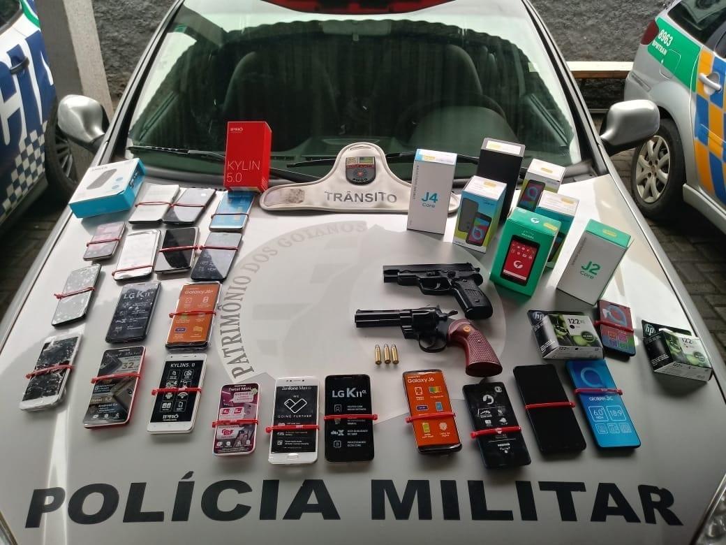 De acordo com os policiais que atuaram na ocorrência, o assalto foi comunicado à polícia por pedestres que passavam pelo local e perceberam que o estabelecimento estava sendo roubado. Os PMs foram até a loja e flagraram um dos autores do crime retirando vários aparelhos celulares das vitrines e colocando dentro de uma bolsa de cor verde. O menor estava com um simulacro de arma de fogo, do tipo pistola, na cintura.