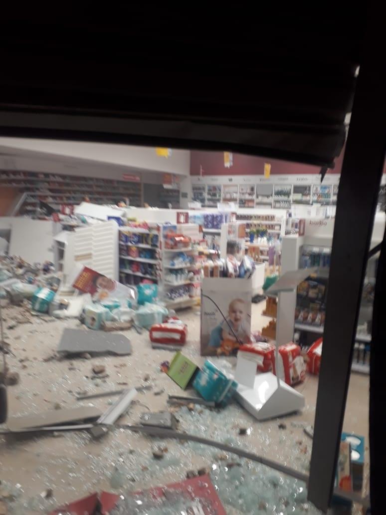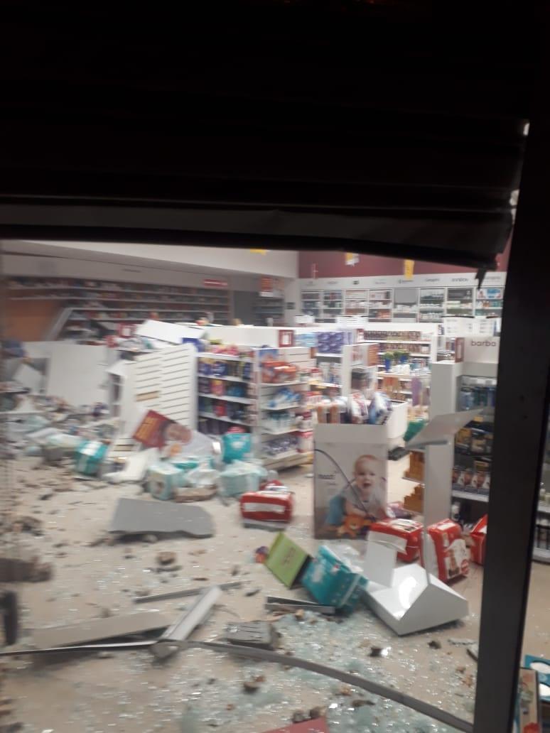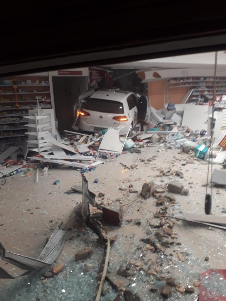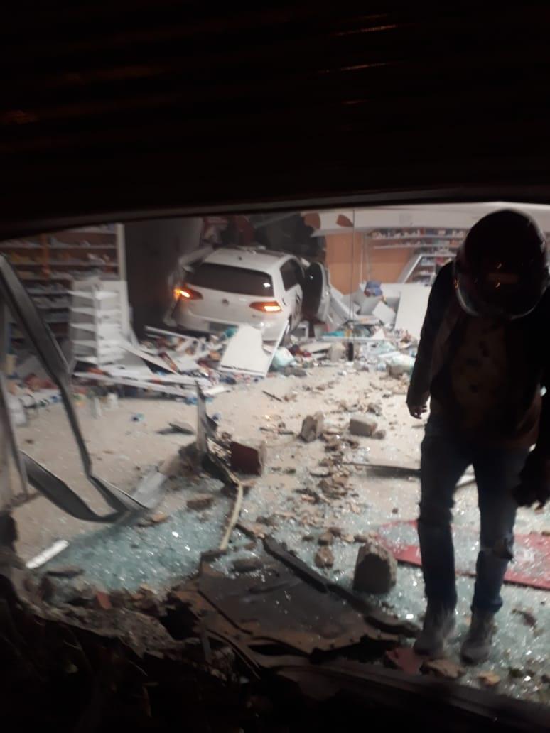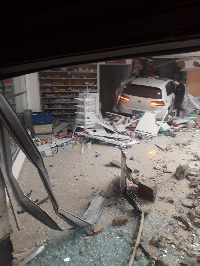 Veja as fotos de como ficou a drogaria após a invasão do carro desgovernado: