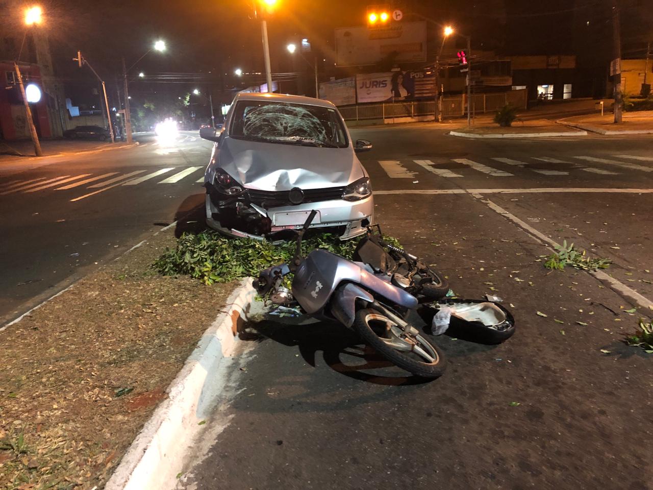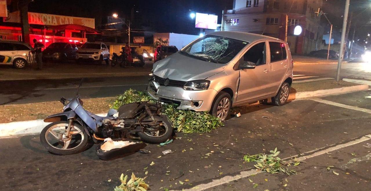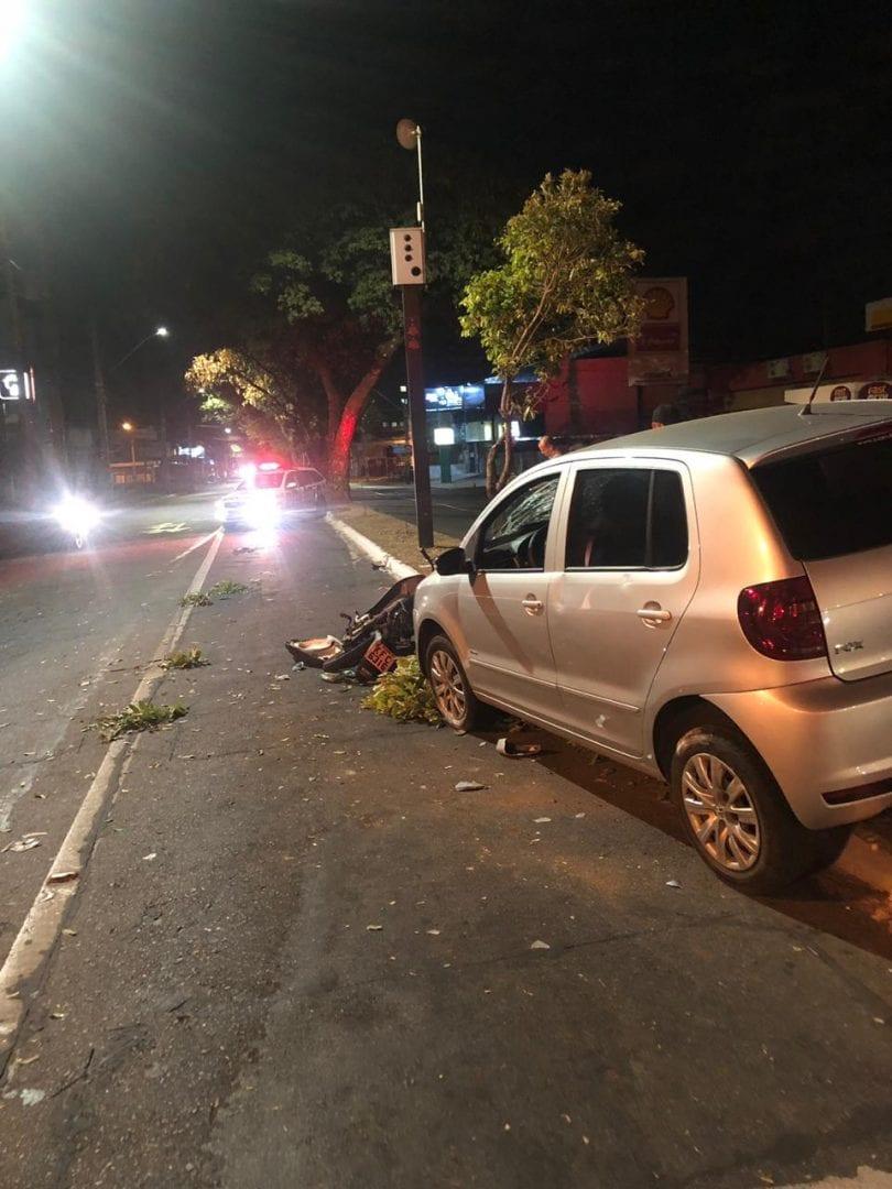 Uma mulher de 37 anos foi arremessada ao chão na madrugada desta quinta-feira (25/7), sofrendo lesões corporais, após um carro colidir com a motocicleta que conduzia, no cruzamento de um bairro de Goiânia.