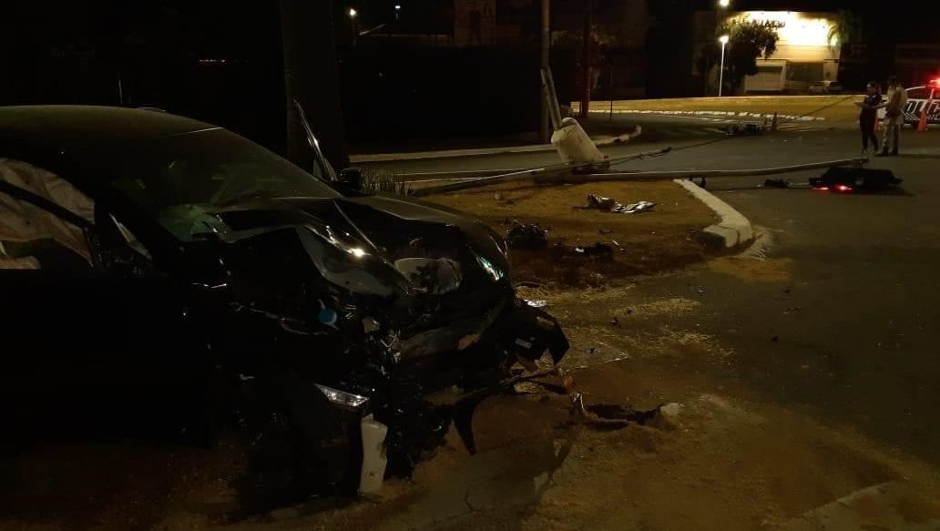 Um acidente entre um carro de passeio e uma moto deixou o trânsito interditado na Avenida 85, no Setor Marista, em Goiânia, na noite desta segunda-feira (29/7). O motorista de um Honda Civic preto bateu em um casal que estava em uma motocicleta, perdeu o controle da direção e só parou ao invadir o canteiro central da via e derrubar um semáforo. Com o impacto, o casal foi arremessado no asfalto; ambos se feriram.