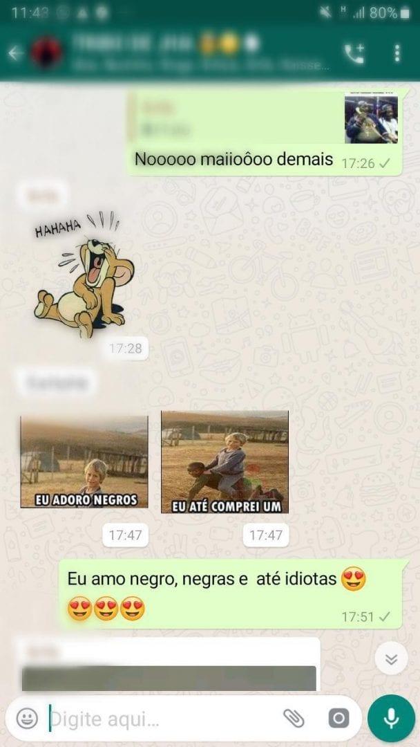 De acordo com informações da Polícia Civil, dois ‘memes’ foram encaminhados para um dos integrantes do grupo, com os dizeres: “Eu adoro negros…até comprei um”, onde uma criança branca aparece montada em uma criança negra, como se essa fosse um animal.