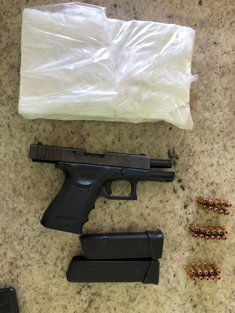 Durante busca pessoal foi encontrado e apreendido uma pistola com dois carregadores e 32 munições Cal .380 intactas. Foi realizada a busca veicular sendo encontrado uma peça de cocaína de aproximadamente 1 quilo. Segundo a corporação, a cocaína é do tipo escama de peixe.