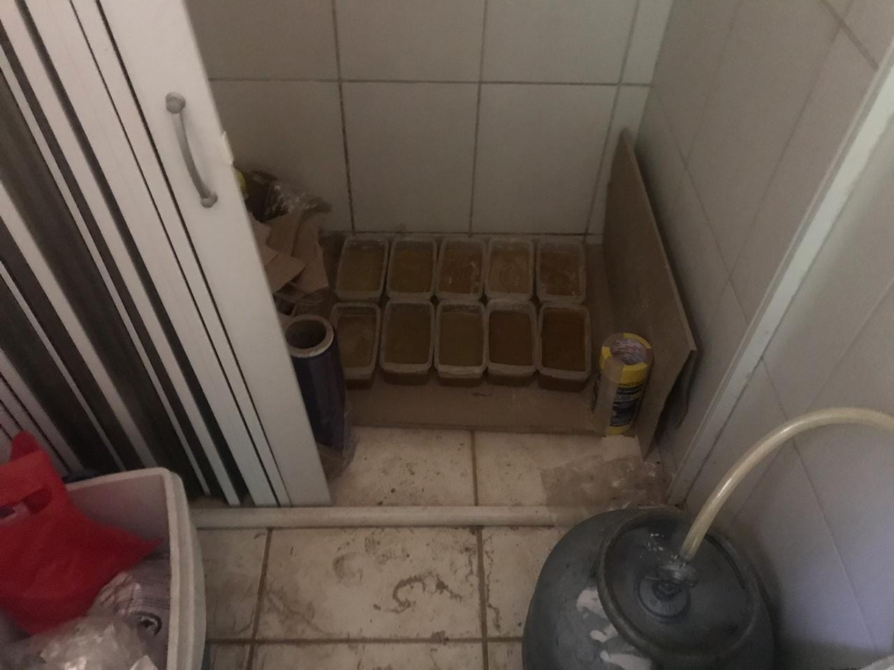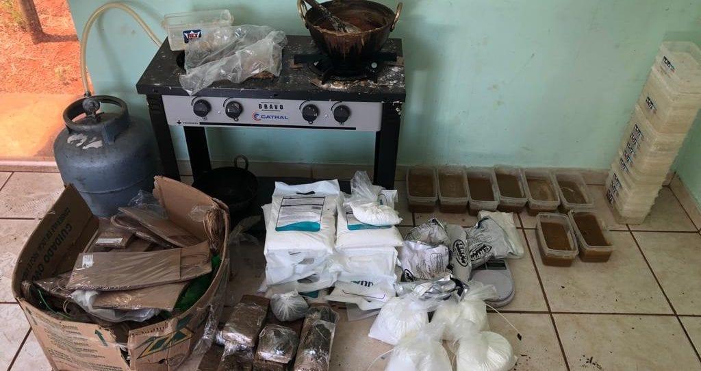 Na residência foram encontrados cerca de 10 quilos de maconha, além de diversos apetrechos para o refino de cocaína, 10 quilos de cocaína, 4,2 quilos de cafeína e 32 quilos de Fenacetina.