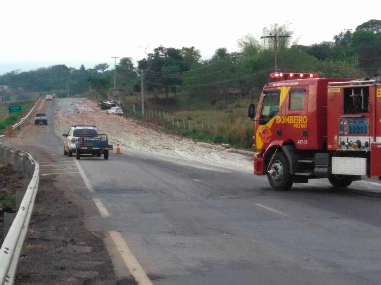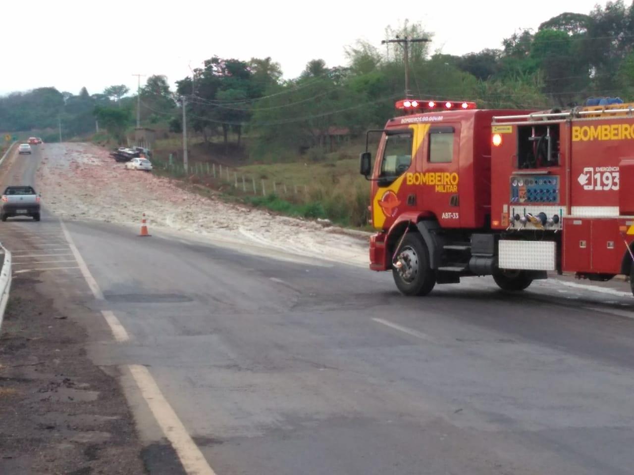 O CBMGO declarou que ainda não há informações sobre o veículo que derramou a carga.