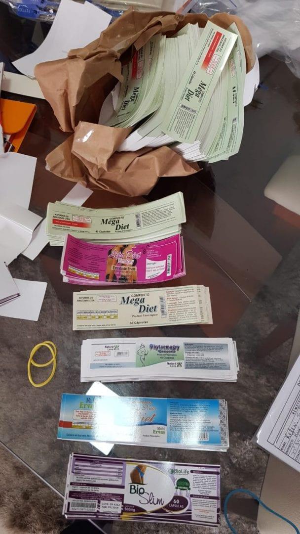 Durante as buscas, os policiais encontraram diversos produtos lacrados para venda, várias caixas de embalagens vazias rotuladas e não não rotuladas; além de fardos de rótulos diversos. As buscas contaram com o apoio de agentes de saúde da Vigilância Sanitária Estadual.